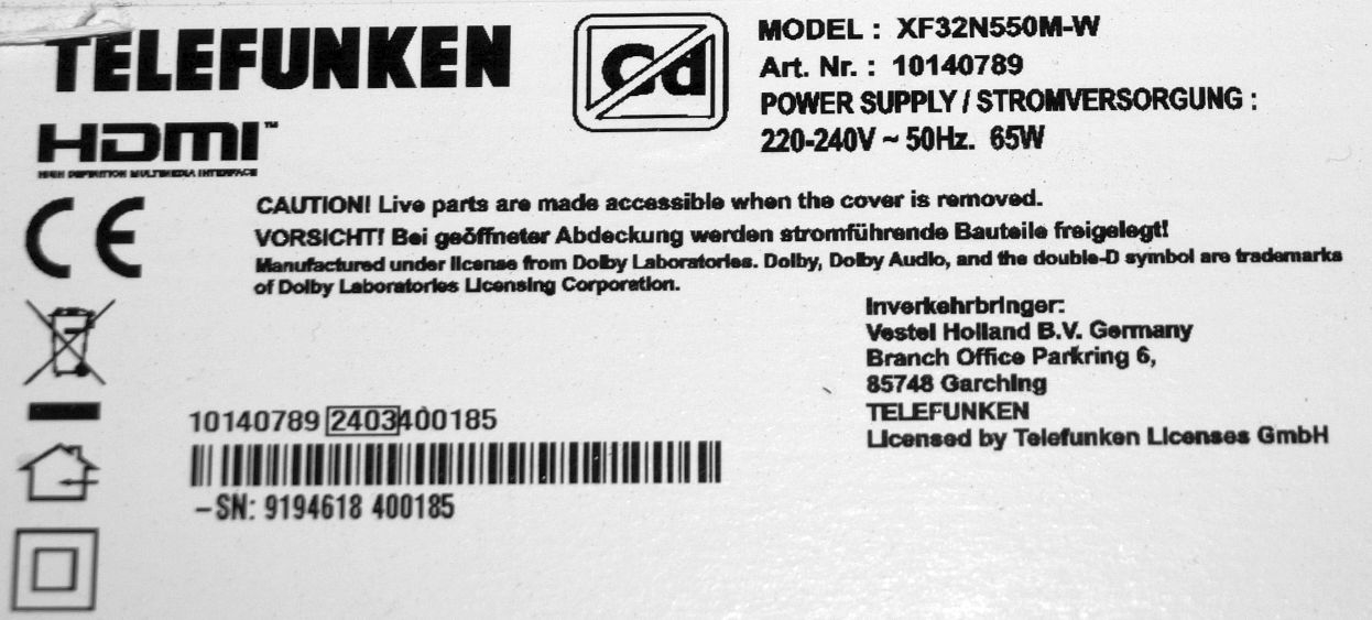 placa de baza OE din tv NOU TELFUNKEN XF32N550M-W 10140789 NonSmart FHD cu ecran VES315UNGH-L3-N41 = PT320CT01-1 Ver.1.3