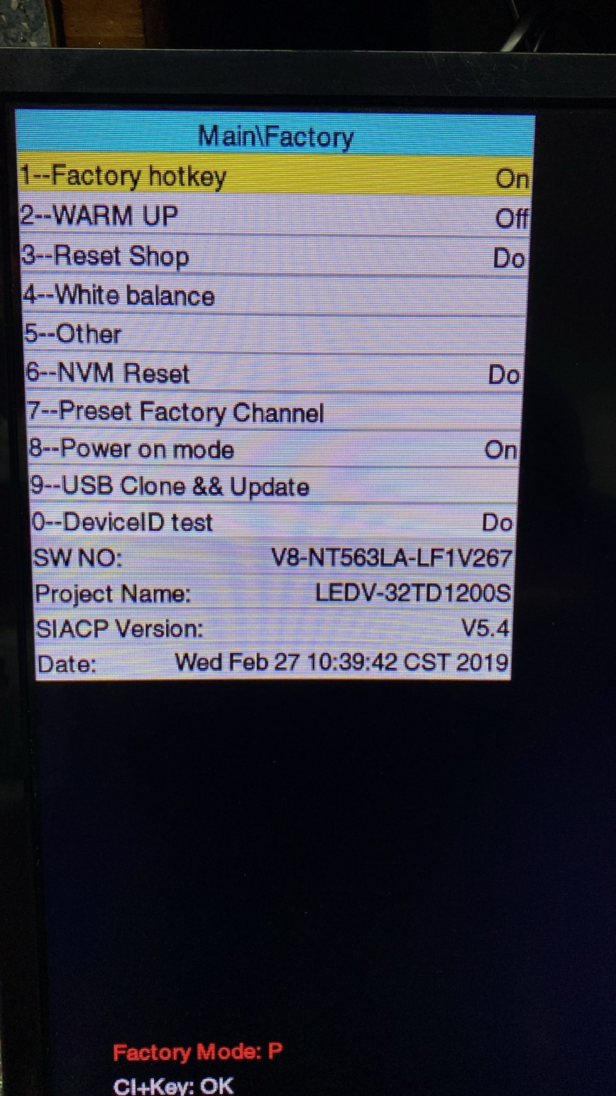 Pentru a dispare afisarea Factory Mode in functionare normala trebuie sa selectam linia Factory Hotkey care e setata ON si sa o setam OFF